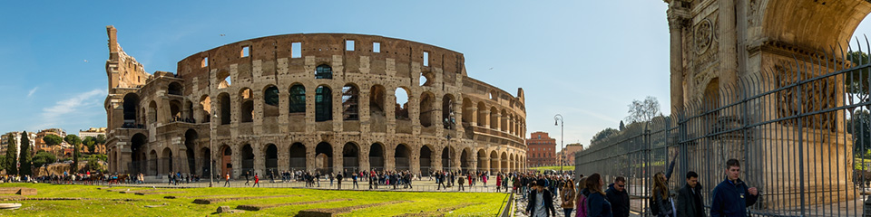 The Colosseum or Coliseum, also known as the Flavian Amphitheatre or Colosseo, is an oval amphitheatre in the centre of the city of Rome, Italy. Built of travertine limestone, tuff (volcanic rock), and brick-faced concrete, it was the largest amphitheatre ever built at the time and held 50,000 to 80,000 spectators. Construction began AD 72 and was completed in AD 80. Further modifications were made (81–96). it was used for gladiatorial contests and public spectacles such as mock sea battles, animal hunts, executions, re-enactments of famous battles, and dramas based on Classical mythology. Also seen in this panorama: Arch of Constantine the Great.