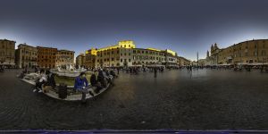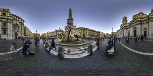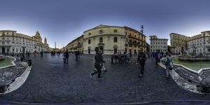 Piazza Navona is a public space/plaza in Rome, Italy. It is built on the site of the Stadium of Domitian, built in the 1st century AD, and follows the form of the open space of the stadium. The ancient Romans went there to watch the agones ("games"), and hence it was known as "Circus Agonalis" ("competition arena"). It is believed that over time the name changed to in avone to navone and eventually to navona. It features important sculptural creations: in the center stands the famous Fontana dei Quattro Fiumi or Fountain of the Four Rivers (1651), topped by the Obelisk of Domitian, brought in pieces from the Circus of Maxentius; the church of Sant'Agnese in Agone, and the Pamphili palace.