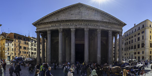 The Piazza della Rotonda is a piazza (city square) in Rome, Italy, on the south side of which is located the Pantheon. The Pantheon is a former Roman temple, now a Catholic church, in Rome, Italy, on the site of an earlier temple commissioned by Marcus Agrippa during the reign of Augustus (27 BC – 14 AD). It was completed by the emperor Hadrian and probably dedicated about 126 AD. The building is cylindrical with a portico of large granite Corinthian columns (eight in the first rank and two groups of four behind) under a pediment.