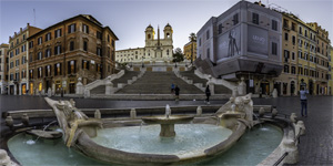 The Spanish Steps are a set of steps in Rome, Italy, climbing a steep slope between the Piazza di Spagna at the base and Piazza Trinità dei Monti, dominated by the Trinità dei Monti church at the top. The monumental stairway of 135 steps was built in 1723–1725, linking the Trinità dei Monti church that was under the patronage of the Bourbon kings of France – located above – and the Bourbon Spanish Embassy to the Holy See – located below – in Palazzo Monaldeschi. In the Piazza di Spagna at the base is the Early Baroque fountain called Fontana della Barcaccia ("Fountain of the longboat" or "Barcaccia Fountain"), built in 1627–29.